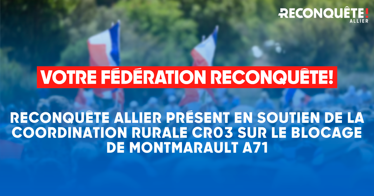 Reconquête Allier présent en soutien de la COORDINATION RURALE CR03 sur le blocage de Montmarault A71 les délégués cantonaux de R!03 ont échangé avec les agriculteurs Reconquête demande une réforme totale de la politique agricole avec diminution importante des normes, baisse des charges , protection de l'agriculture française (comme le prévoyait la PAC avant 1992), autosuffisance agricole pour la FRANCE, révision des procédures de lutte contre la DNC.