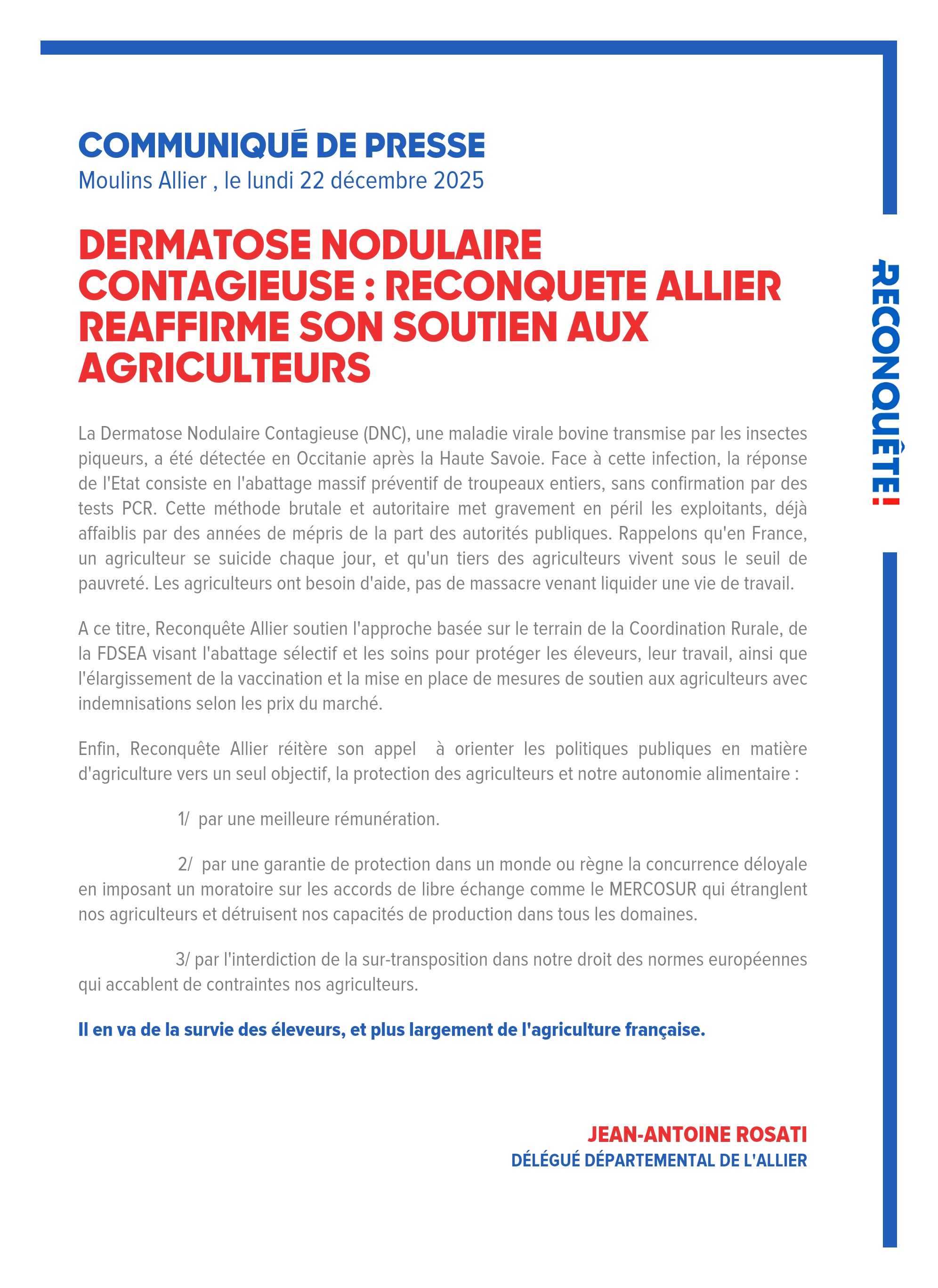 A ce titre, Reconquête Allier soutien l'approche basée sur le terrain de la Coordination Rurale, de la FDSEA visant l'abattage sélectif et les soins pour protéger les éleveurs, leur travail, ainsi que l'élargissement de la vaccination et la mise en place de mesures de soutien aux agriculteurs avec indemnisations selon les prix du marché.